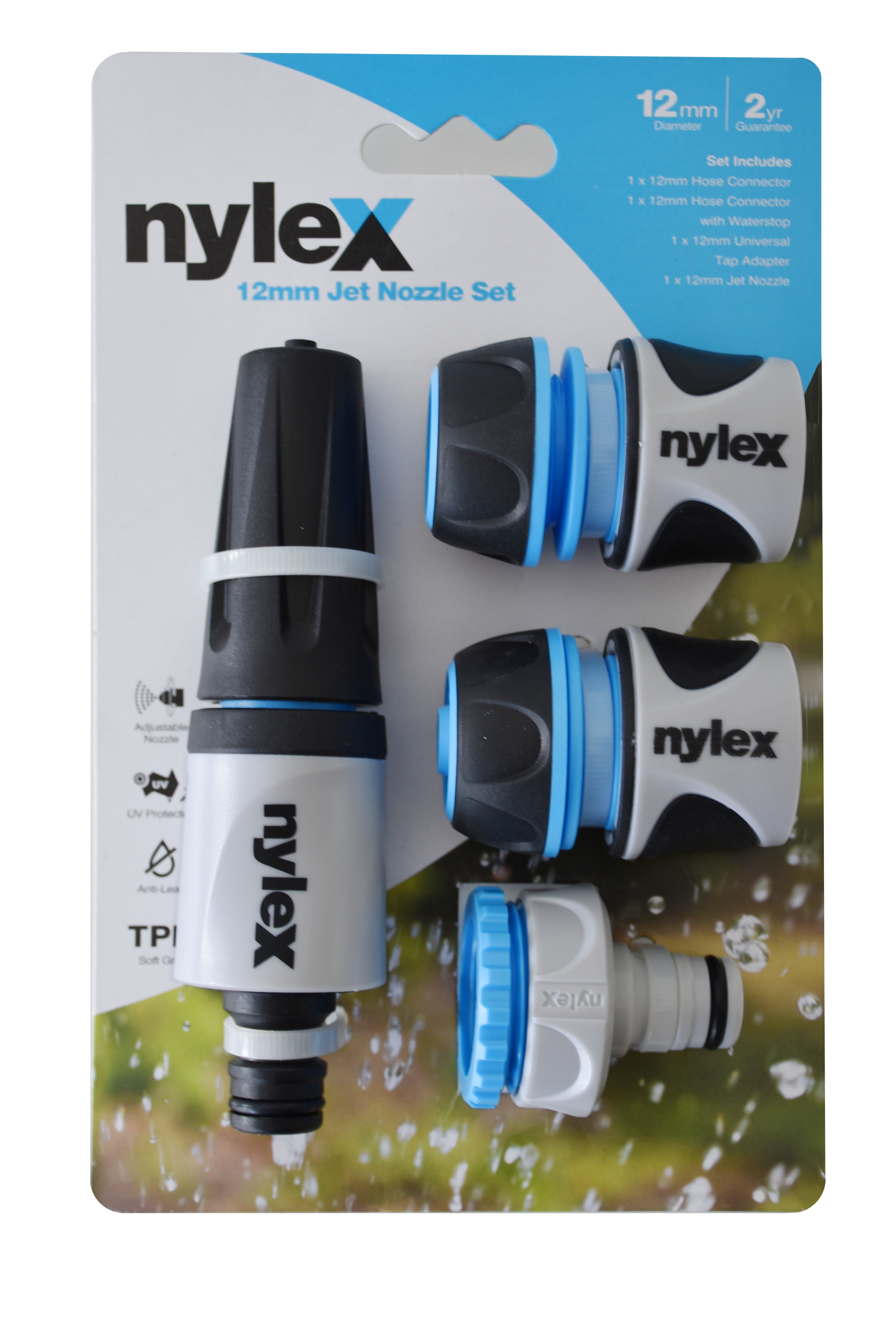 The Nylex 12mm Fitting Sets contain two connectors and a universal tap adapter. The connectors feature TPR soft grips that provide extra grip making these fittings suitable for all weather conditions. The fully adjustable nozzle allows you to simply change the spray pattern from an ‘off’ position to a strong jet or fine mist spray.