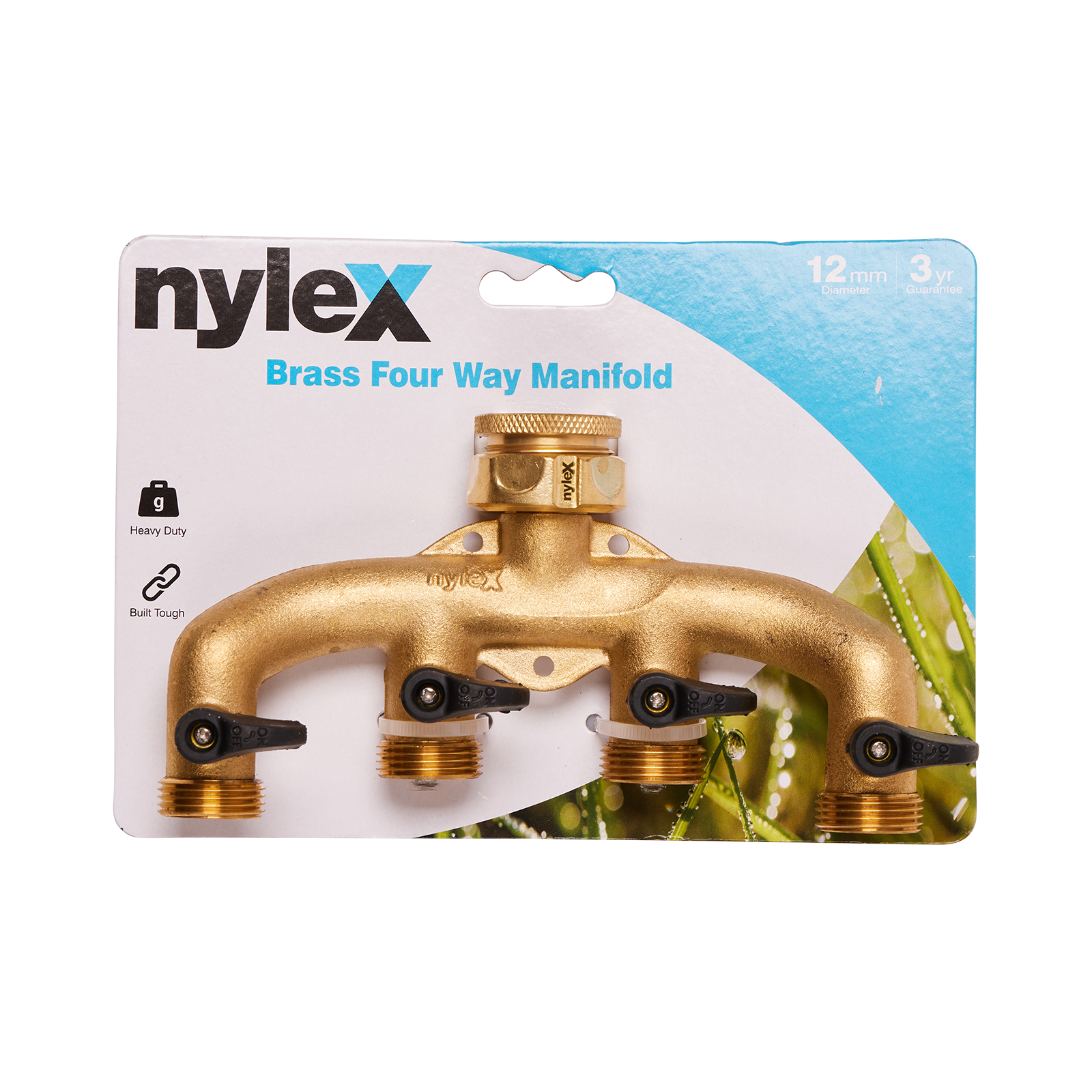 The Nylex Brass Four-way Manifold converts one tap into a multifunctional watering area, allowing you to use four hoses from the same tap.