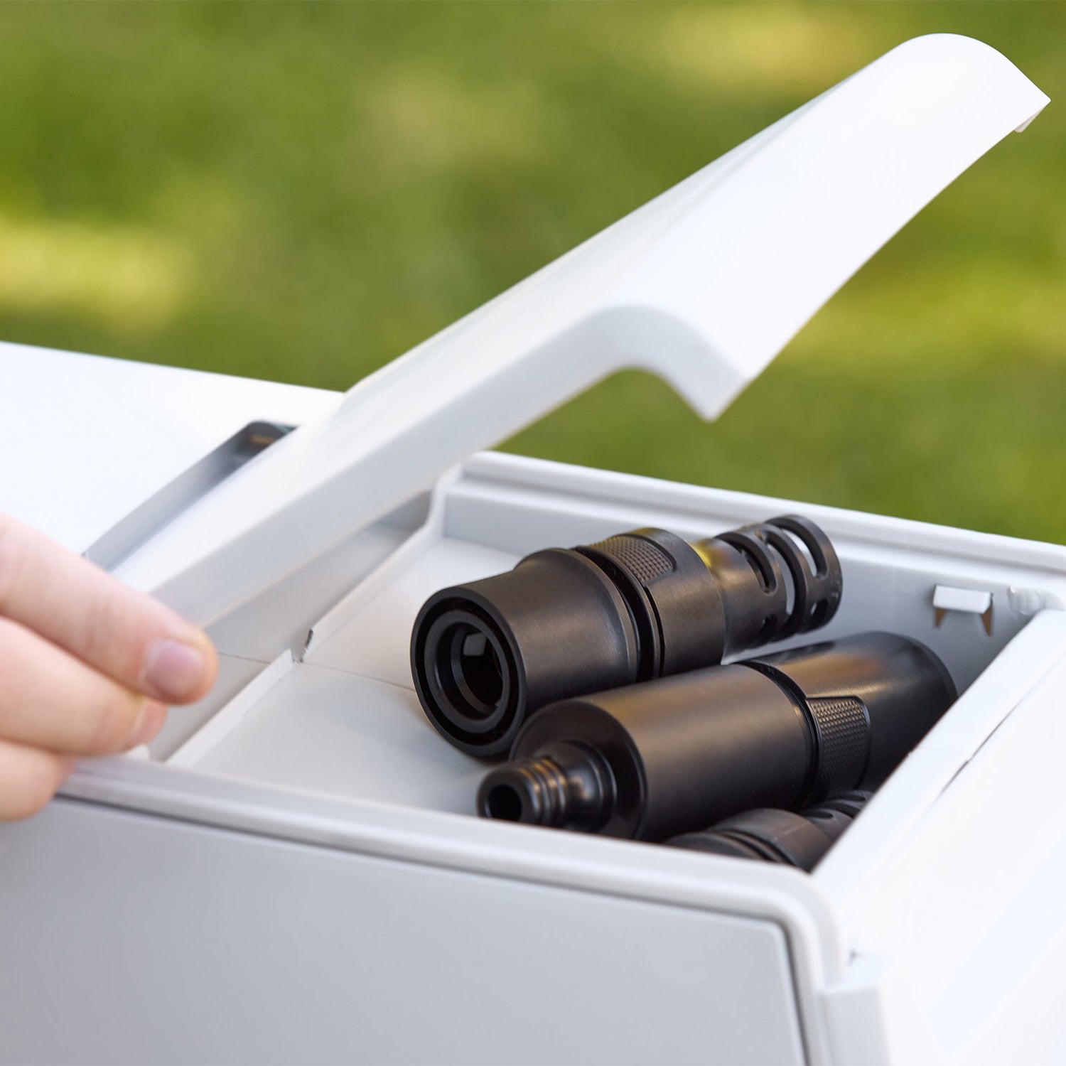 Slim, sleek, and architectural in style, it’s built to enhance your outdoor space, not clutter it. A discreet storage compartment keeps your fittings and accessories neatly tucked away, while the compact design fits seamlessly into any outdoor space.