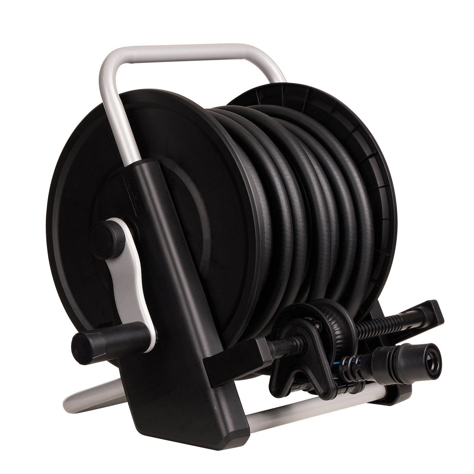 The built-in hose guide ensures the hose winds evenly onto the spool, while the angled hose connection prevents kinks and twists for maximum water flow. With integrated hose-end mounts, you can keep connectors neatly stored and ready for next use, all protected by UV-stabilised plastic that withstands all weather conditions.